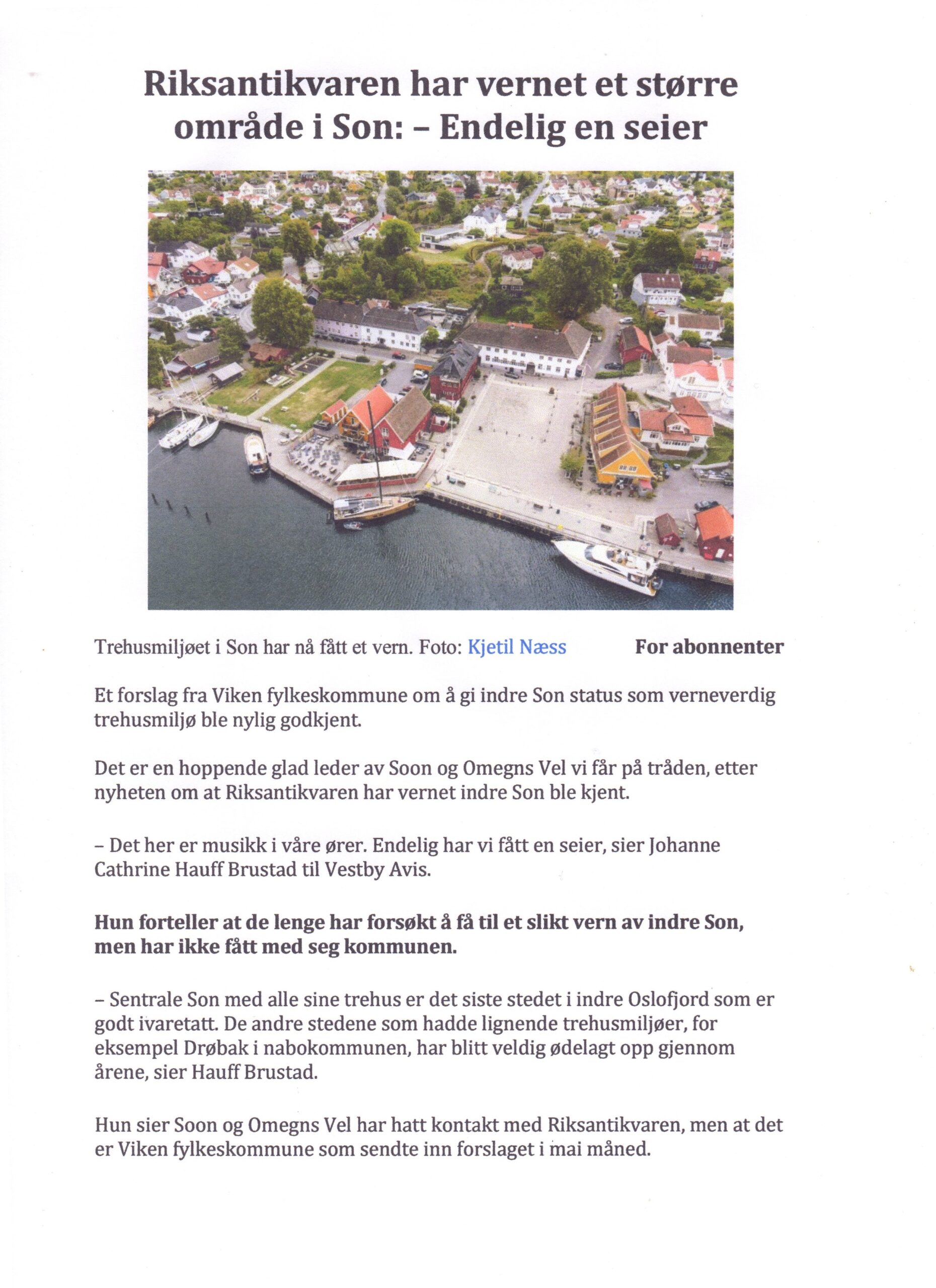 Vestby Avis – for abonnenter: Riksantikvaren har vernet et større område i Son: – Endelig en seier Trehusmiljøet i Son har nå fått et vern. Foto: Kjetil Næss For abonnenter Et forslag fra Viken fylkeskommune om å gi indre Son status som verneverdig trehusmiljø ble nylig godkjent. Det er en hoppende glad leder av Soon og